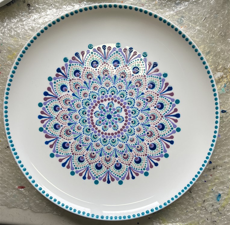 Voor het servies gebruik ik Pebeo porseleinverf. Deze artikelen worden afgebakken in de over en kunnen daarna gewoon afgewassen worden. Er wordt geadviseerd om dit niet in de afwasmachine te doen.